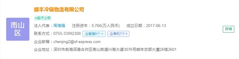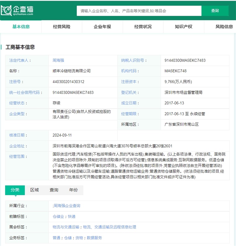 企查貓資料顯示,順豐冷鏈物流有限公司(簡稱:順豐冷運(yùn))成立于2017年6月,注冊資金為9,766(萬人民幣),是順豐速運(yùn)推出冷鏈物流品牌。提供冷運(yùn)倉儲、冷運(yùn)干線、冷運(yùn)宅配、生鮮食品銷售及供應(yīng)鏈金融等一站式服務(wù)。其業(yè)務(wù)覆蓋全國56個城市,擁有71條食品干線和12條醫(yī)藥干線。超過15萬平方米的冷倉面積和萬余輛冷藏車。順豐冷運(yùn)憑借其強(qiáng)大的物流基礎(chǔ)設(shè)施和先進(jìn)的技術(shù),成為冷鏈物流行業(yè)的頭部企業(yè)之一。