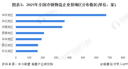 據(jù)中冷聯(lián)盟發(fā)布的《全國冷鏈物流企業(yè)分布圖》顯示,2021年,我國冷鏈物流企業(yè)數(shù)量約2116家。按地區(qū)來看,華東地區(qū)冷鏈物流企業(yè)數(shù)量最多,為674家,遠(yuǎn)多于其他地區(qū)。其次是華北地區(qū)與華南地區(qū),分別為363家與346家,均多于300家。企業(yè)數(shù)量最少的為東北地區(qū),為162家。