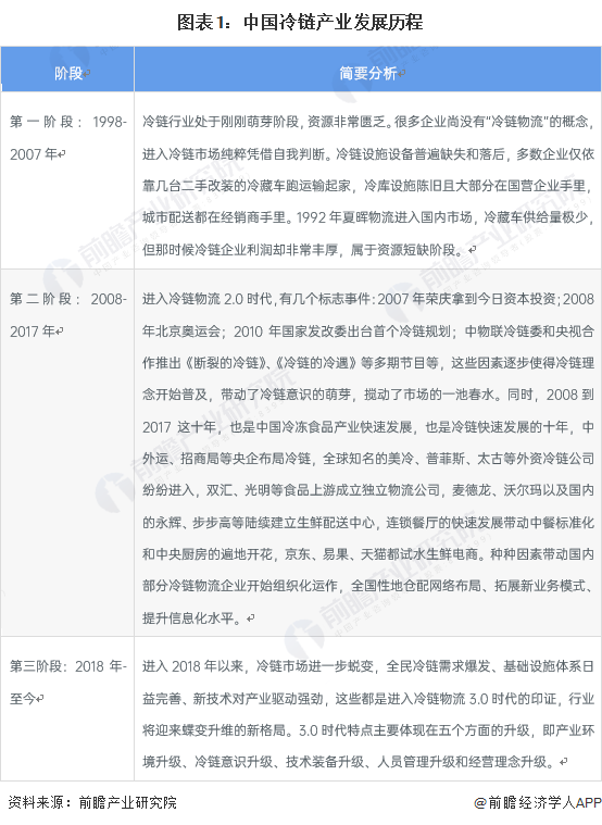 1998年以來,我國冷鏈物流大致經(jīng)歷三個階段,主要是從第一階段的萌芽到第二階段的迅速擴(kuò)張,再到如今在2020年疫情等因素的催化下將冷鏈物流體系日益完善。
