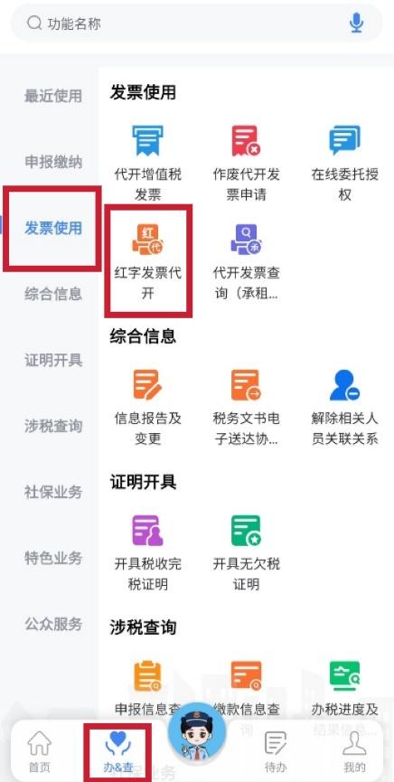 點擊【辦&查】-【發(fā)票使用】-【紅字發(fā)票代開】,進入發(fā)票紅沖功能。